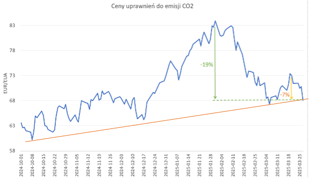 W ciągu ostatnich 7 sesji ceny uprawnień do emisji CO2 spadły o 7%, natomiast w perspektywie ostatnich 2 miesięcy to już prawie 20%.