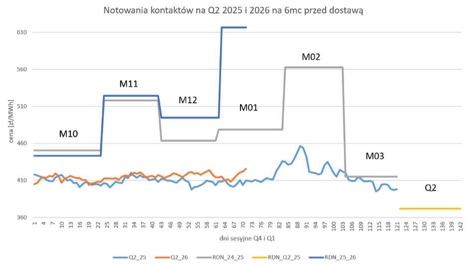 W ciągu ostatnich 6 sesji (8 stycznia – 16 stycznia 2026) ceny kontraktu z dostawą na Q2 2026 wzrosły o ponad 23 zł/MWh (do poziomu 432 zł/MWh).